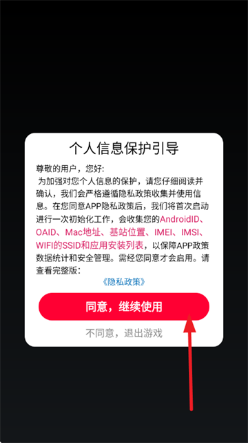 1、首先打开游戏,点击“同意继续使用”按钮进入游戏;