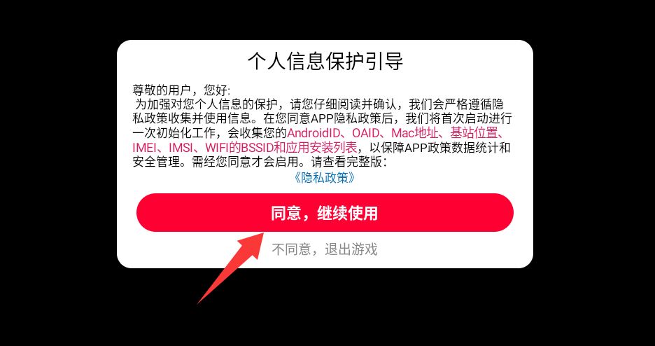 1、点击个人信息保护引导里的同意并继续。