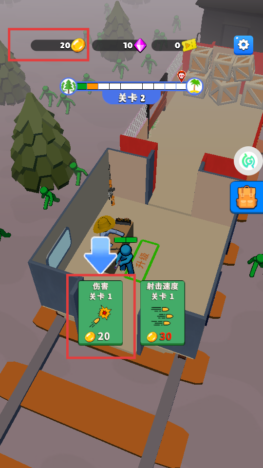 4、消耗20金币升级【伤害-关卡1】,提升武器杀伤力,能更快击杀丧尸,应对后续更难关卡。