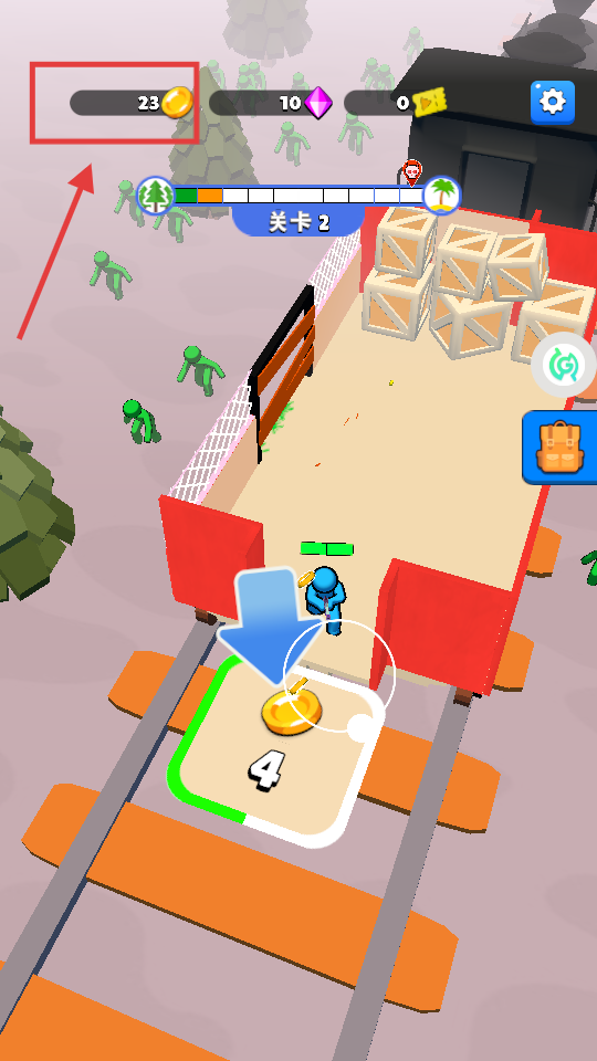 3、通关后进入关卡2,捡起地上金币积累资源,注意周围丧尸动向,为升级武器做准备。