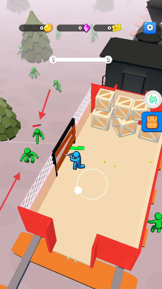 2、瞄准靠近的绿色丧尸射击,借助车厢围栏、木箱作掩体,优先消灭近身的,避免被围攻。
