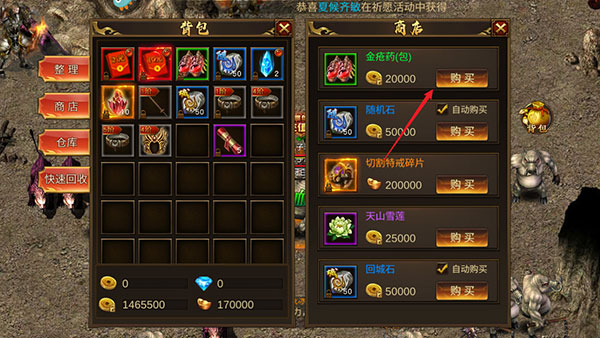 2、进入背包界面后,在商城中找到【金疮药(包)】,并点击购买,如下图所示。