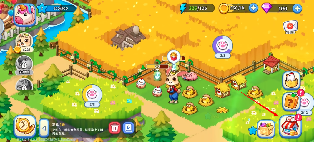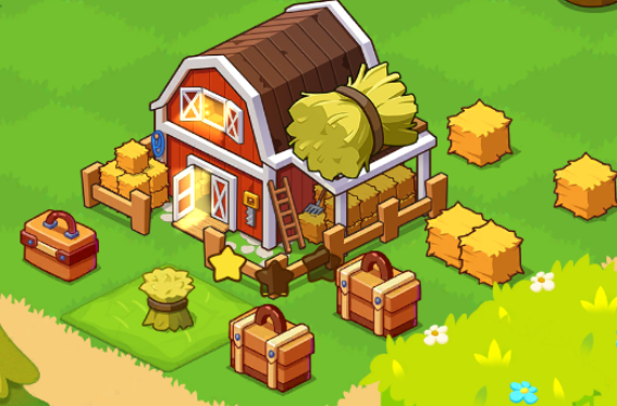解锁一定的土地,可看到干草工坊,采集产出草料,合成草料后得到可移动的干草堆,采集干草堆可获得杂物宝箱(游戏里叫小皮箱、皮箱)。