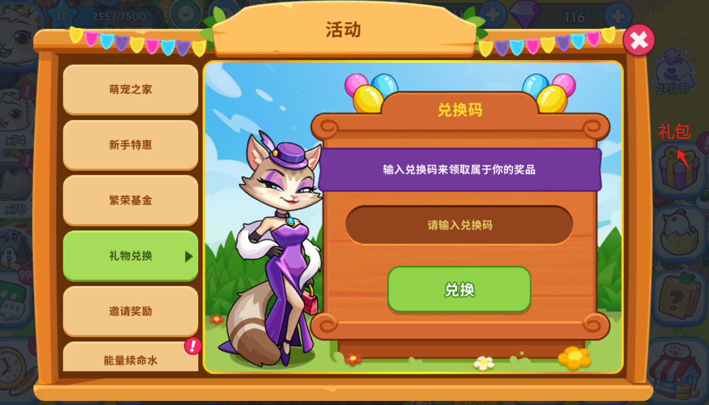 进入游戏后,点击礼包→礼物兑换→输入兑换码,领取奖励。