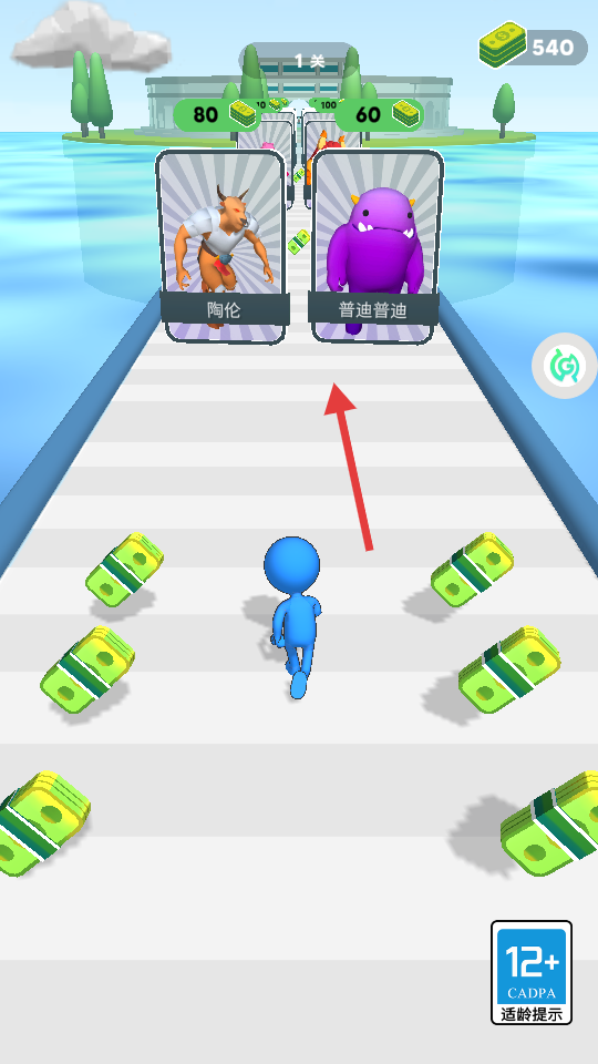 1、玩家操作角色前进获取道路上的金币用来兑换角色。
