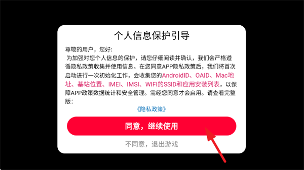 1、首先打开游戏。点击“同意继续使用”;