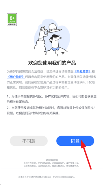 1、首先打开游戏,阅读并同意《隐私政策》和《用户协议》;