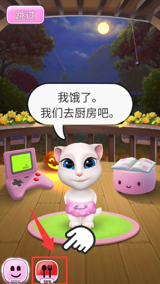 1、进入游戏小猫咪说饿了,点击红色框框里的厨房并进入。