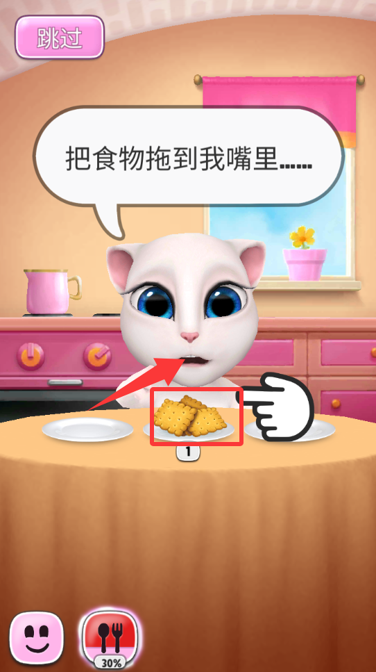 2、把红色框框里的饼干拖到到小猫咪的嘴里。