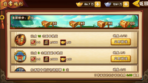 小红点全部点完了之后,可以看下日常任务中还有什么没有做,查漏补缺。完成每日任务可以获得积分,积分达到一定数量可以开启每日积分宝箱。积分宝箱内有元宝和体力丹是一定要拿到的。