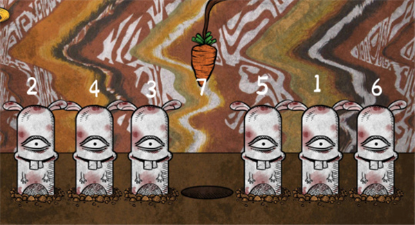 按照图中的顺序点击洞口,会出现七只兔子。处在中间的兔子会被胡萝卜吸引,最后“咬勾”大鱼将兔子吃掉,得到兔子骨架。(兔子那么可爱,怎么能吃兔子?)“一切都是为了新生”