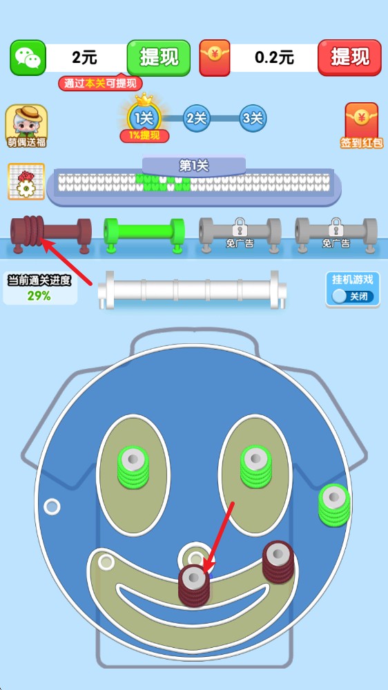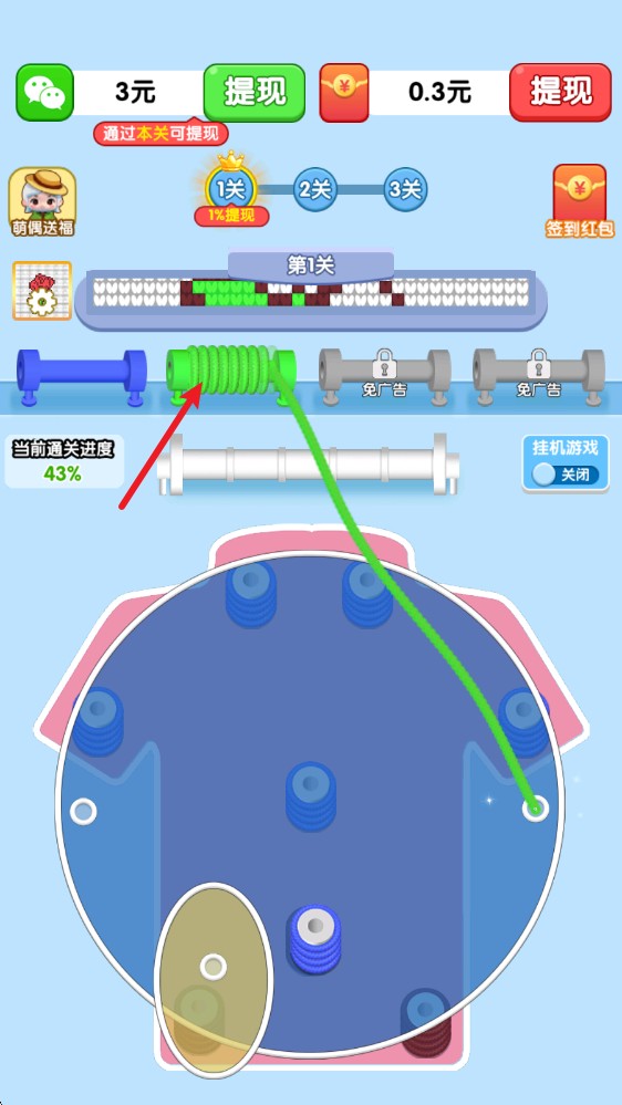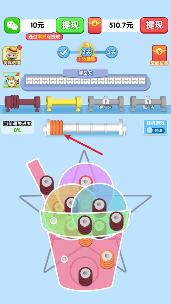 1、游戏中点击下方的毛线就可以将其放入对应颜色的毛线架上。
