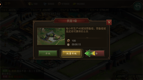 进入游戏之后首先需要做的就是发展自己的城池,首先就是建立自己的民居,民居可以生产预备役,预备役则是武将携带的士兵,也是最基础的兵,需要多的生产。