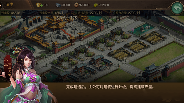 同时我们也需要升级自己的太守府,因为太守府的等级是提高其他建筑等级的标杆。太守府的升级是需要金币的,而且需要一定的时间,等级越高需要的时间越多,不过可以使用加速道具来减少升级时间。