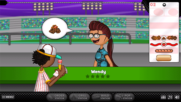 4、烤好我们就来到加料区,按照右侧的菜单将番茄酱均匀的挤到热狗上,然后再加棕色的那个豆子。依次往上加。