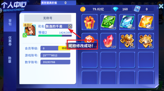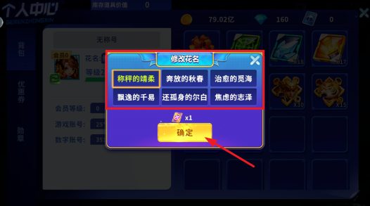 3.选择一款喜欢的昵称点击,再点击确定;值得注意的是更改昵称需要花费一张改名卡哦