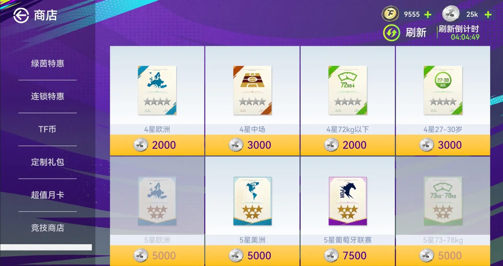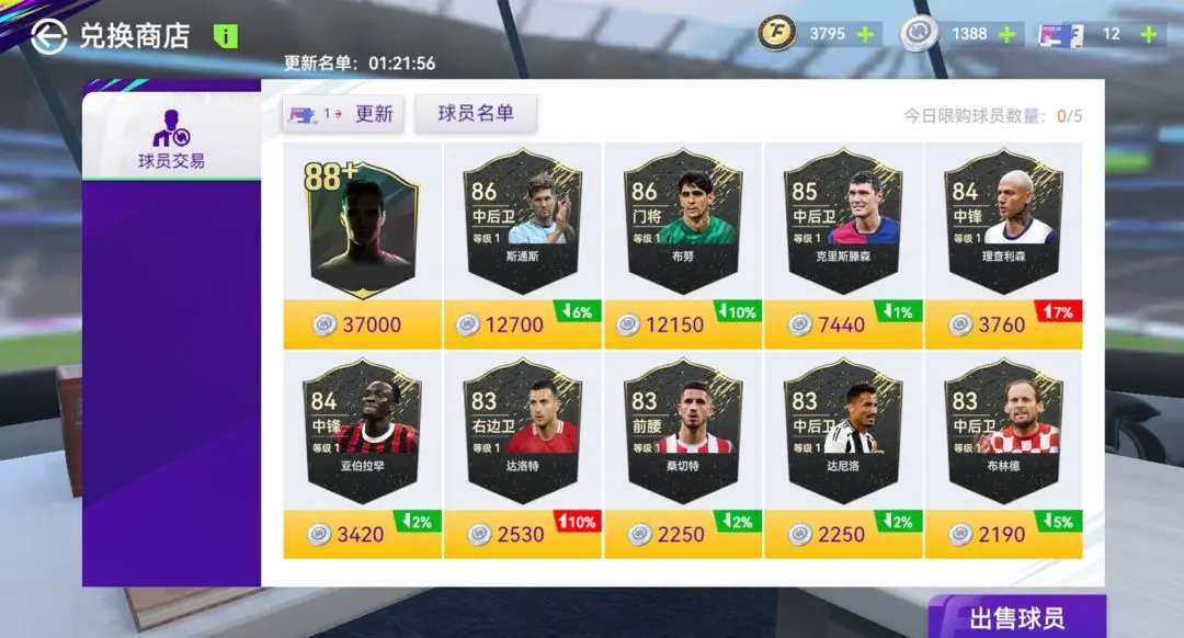 商店限时刷新当前赛季黑卡,可以使用转会币直接购买球员。商店也可以自行刷新,当日首次刷新免费,第2-3次需要1张刷新券,第4-5次需要2张刷新券,第6次开始需要3张刷新券,次日0点重置。注:球员名单为可以在商店里购买的球员以及购买价格展示,此处无法购买球员,需要在刷新出的球员中进行购买。