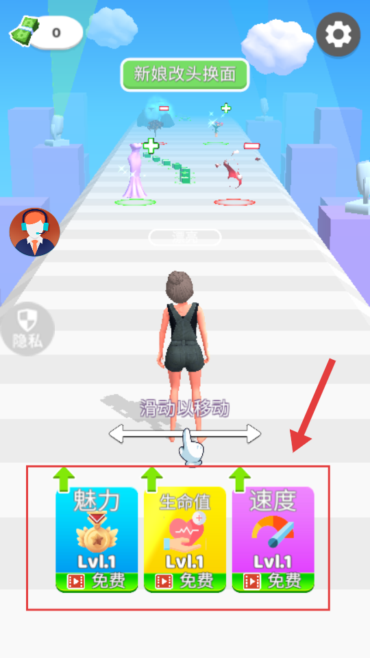 2、在【新娘改头换面】关卡,通过滑动操控角色移动,优先升级【魅力】【生命值】【速度】等免费属性提升能力。