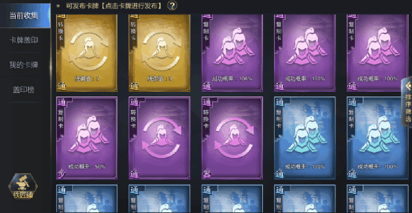 印玺:可以查看当前玩家正在收集神秘卡的盖印状态,每名玩家只能发布一张神秘卡,发布的神秘卡必须盖印完毕才可,或是取消当前发布的神秘卡,才可发布新神秘卡。印玺种类分别为金碧印玺、琉璃印玺、翡翠印玺、青石印玺,提高爵位或官职,可以解锁相应的印玺。每种印玺每天都有不同的使用上限,可额外消耗元宝购买。帮助世族内成员盖印也可以获得世族贡献。盖印榜可以查看世族成员盖印次数情况。