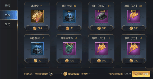 商店:消耗玩家贡献值购买所需要的商品,每日12、18点自动刷新,商店每日刷新次数30次,每日赠送5次免费刷新次数。
