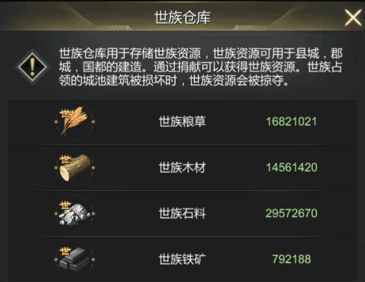 仓库:世族仓库用于存储世族资源,世族资源可用于被世族占领的建筑。通过捐献可获得世族资源,世族占领的城池被损坏时,世族资源会掠夺。