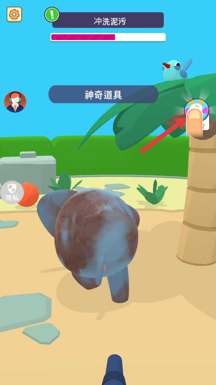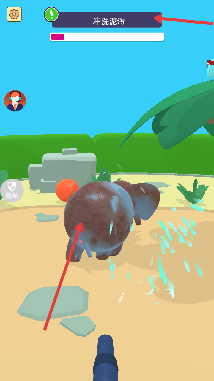 3、按照任务【冲洗泥污】,对大象身上的泥污进行冲洗。