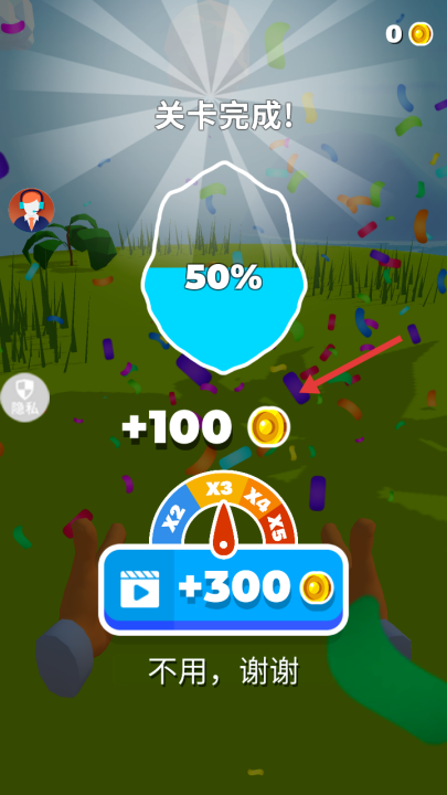 3、关卡完成后,界面显示“关卡完成!”,可领取100金币(点击金币图标)。