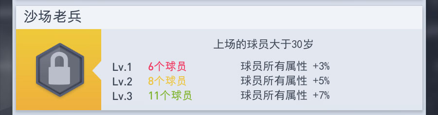 上场的球员大于30岁。6个球员:球员所有属性+3%;8个球员:球员所有属性+5%;11个球员:球员所有属性+7%。