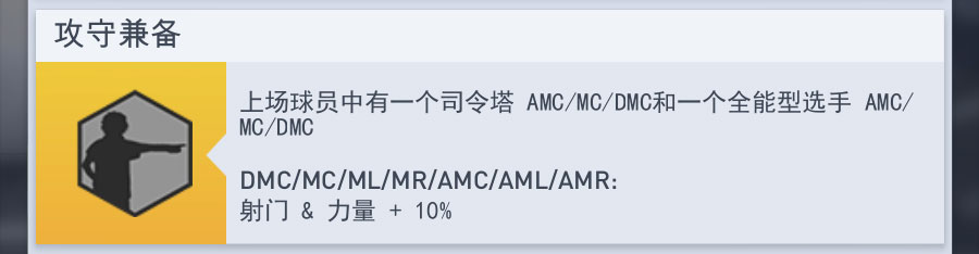 上场球员中有一个内切高手AML/ML/WBL和一个内切高手AMR/MR/WBR。DMC/MC/ML/MR/AMC/AML/AMR:盘带和射门+10%。