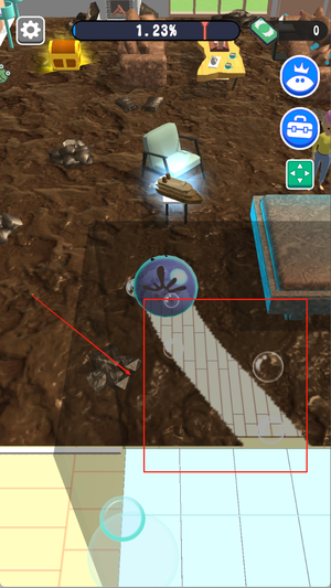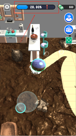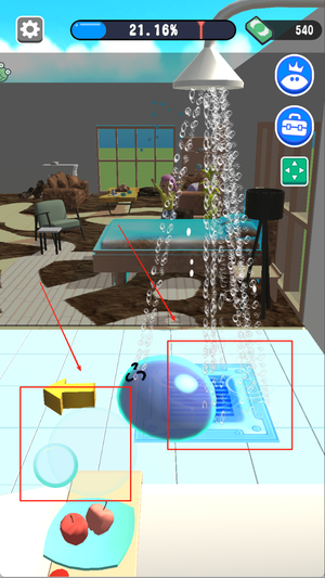 1、玩家从澡堂出发前往各区域清扫,操控史莱姆滚动收集污染物完成指定目标。