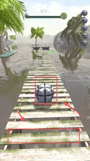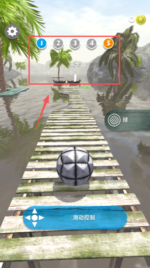 2、左侧虚拟摇杆控制小球移动方向,右侧为加速与跳跃按钮,屏幕上方显示当前进度与收集数量。