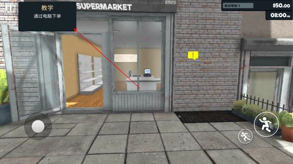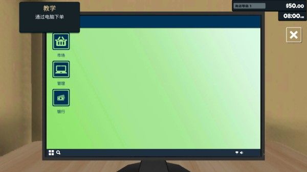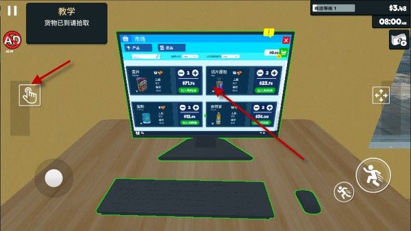 1、进入游戏之后,我们可以跟着左上角的教学一起,首先到超市内的电脑上进行网上订货。