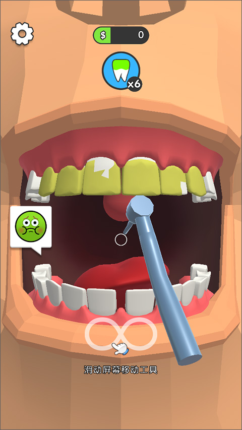 1、第一关玩家点击开始,然后滑动屏幕移动工具给患者清理牙齿上的菌斑;