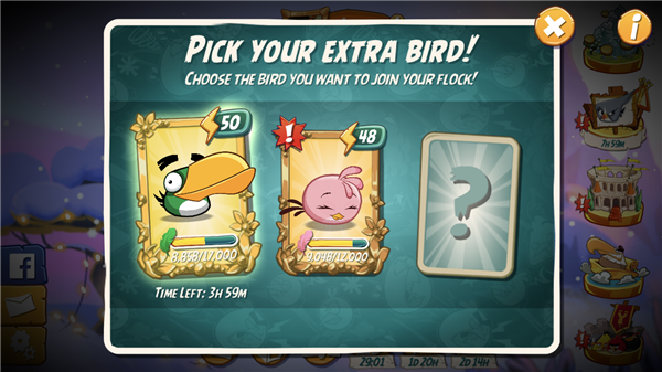 你有注意到大红旁边的问号吗?点一下它,你会发现我们挪出空间来扩展你的鸟群了! 要解锁编外小鸟,你需要收集可在地图上找到的特殊钥匙。