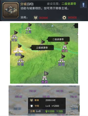 二级资源带属于高级迁城了,需要学问府14级研究相关科技开启分城,但是这个是可以自己选择准确位置,迁城后可获得更大的资源量和存储上限,