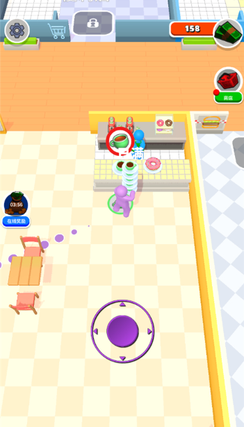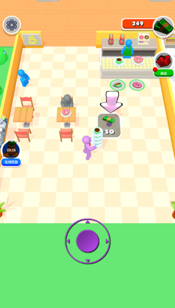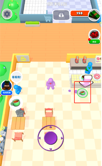 2、根据地板上紫色小圆点的标志行走到目的地,我们控制角色走到吧台;