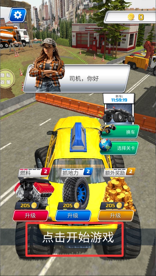 1、启动游戏后直接点击中央的"出发"按钮,系统会自动载入新手教程场景并进入卡车驾驶准备环节。
