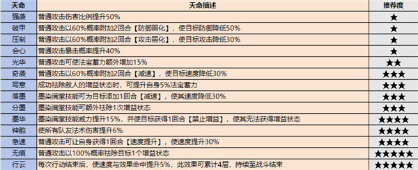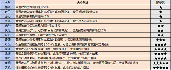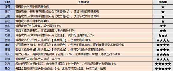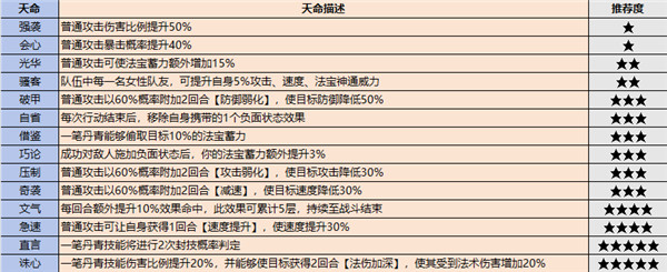 只有绝伦以上的高品质弟子才会自带天命,天命技能也有优劣之分,这里整理了一下各职业的天命排行,大家可以参考一下。值得注意的是,紫色弟子也可以通过服用九转金丹获得天命效果。