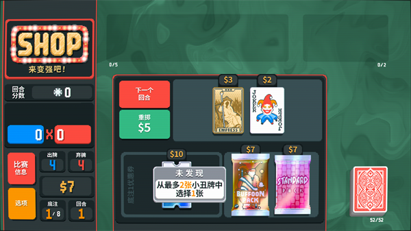 ps:这边建议跳过新手的教程,少花两枚金币,任何就可以直接购买7块的小丑卡牌和塔罗牌了。