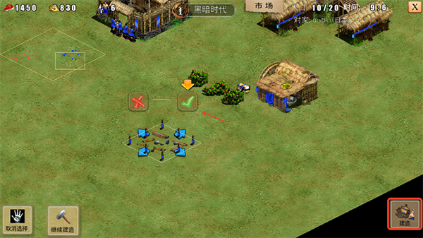 1、建造技巧:选择农民后点击“建造”,选择建筑类型并放置空地,确定后开始建造。