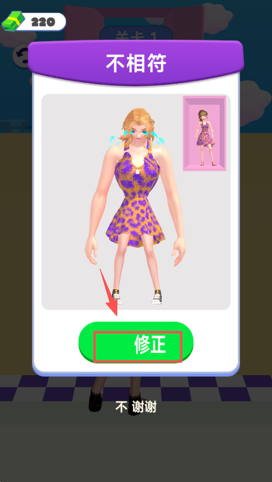 3、如果装扮不正确,点击“修正”按钮调整,确保符合关卡要求。