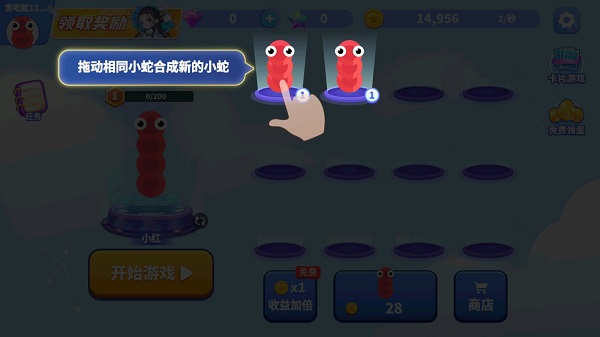 2、拖动相同小蛇进行两两合成,便可生成一条全新的小蛇,外观、形态都有变化哦。