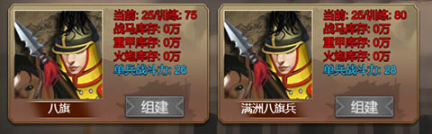军事能力:先看皇太极的特殊兵种——八旗兵。两个兵种的组建都是用两种三级武器加一种一级武器完成,训练度80也不算太高。需注意战马需要双倍,但是自带可买双倍战马技能的皇太极基本是不缺马,反而需要注意其他的兵器。