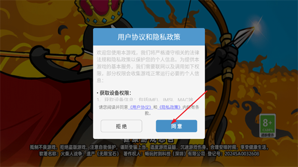 1、首先打开游戏,阅读并同意《用户协议》和《隐私政策》;