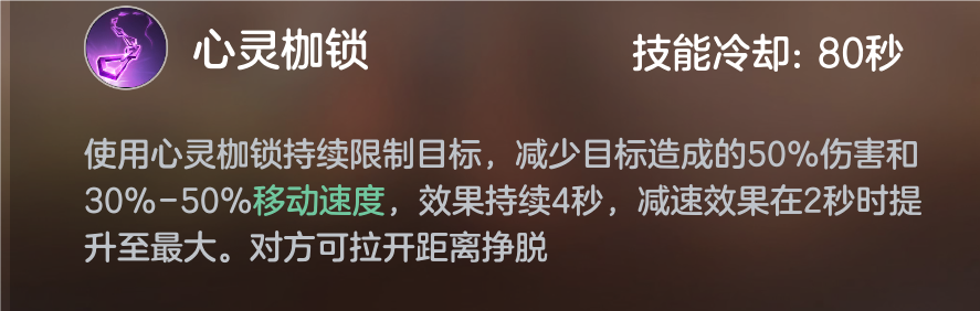 心灵枷锁用于限制敌人,岚的高机动性决定了一旦给对面套上心灵枷锁几乎就不可能被挣开。