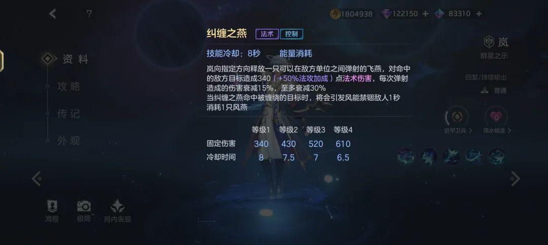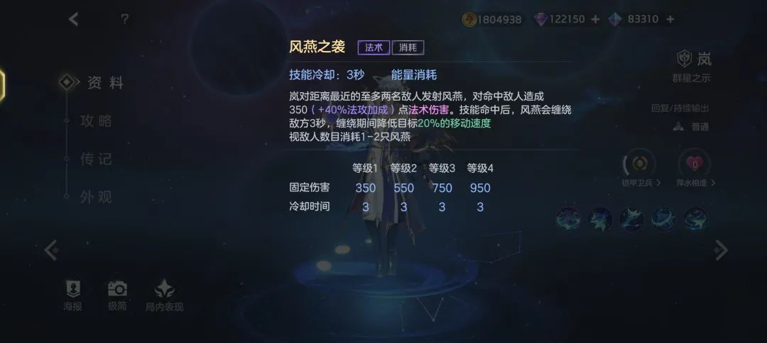岚对距离最近的至多两名敌人发射风燕,对命中敌人造成350(+200/lv)(+40%法攻加成)点法术伤害。技能命中后,风燕会缠绕敌方3秒,缠绕期间降低目标20%的移动速度。