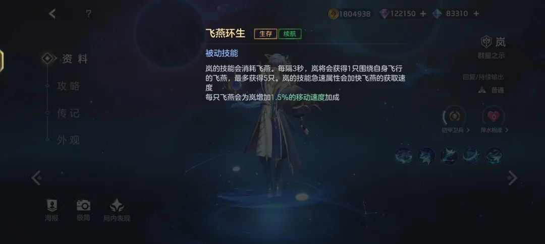 岚的技能会消耗飞燕。每隔3秒,岚将会获得1只围绕自身飞行的飞燕,最多获得5只。岚的技能急速属性会加快飞燕的获取速度。