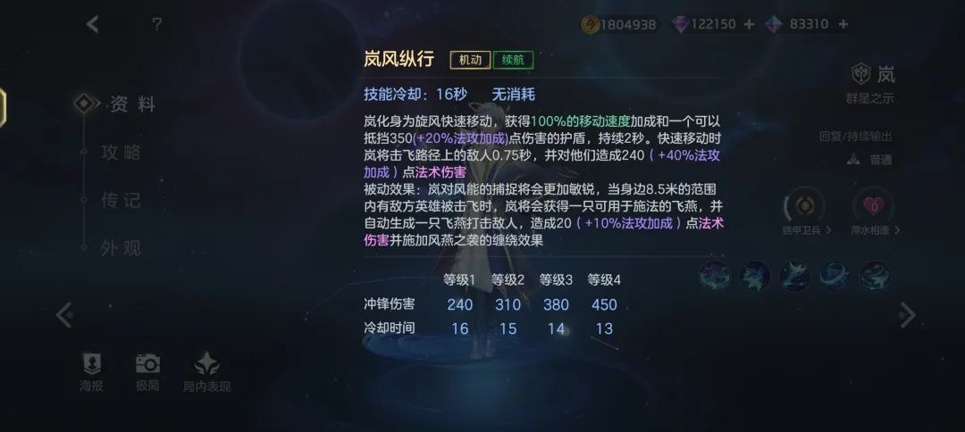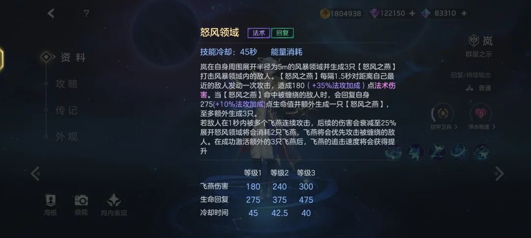 岚在自身周围展开半径为5m的风暴领域并生成3只【怒风之燕】打击风暴领域内的敌人。【怒风之燕】每隔1.5秒对距离自己最近的敌人发动一次攻击,造成180(+60/lv)(+35%法攻加成)点法术伤害。当【怒风之燕】命中被缠绕的敌人时,会回复自身