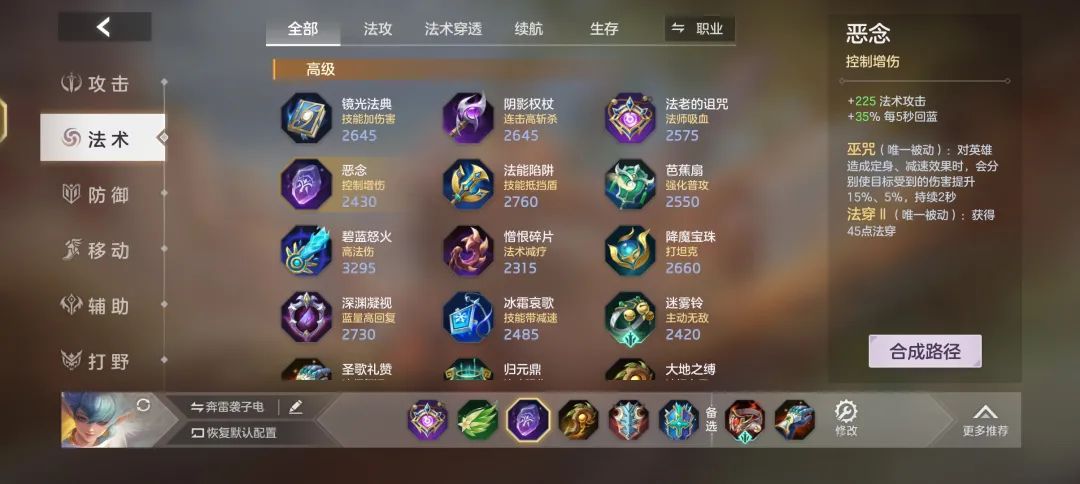 第四件装备选择恶念,增加穿透效果,而且恶念被动带来的巫咒效果也可以跟岚完美配合。