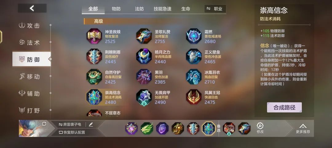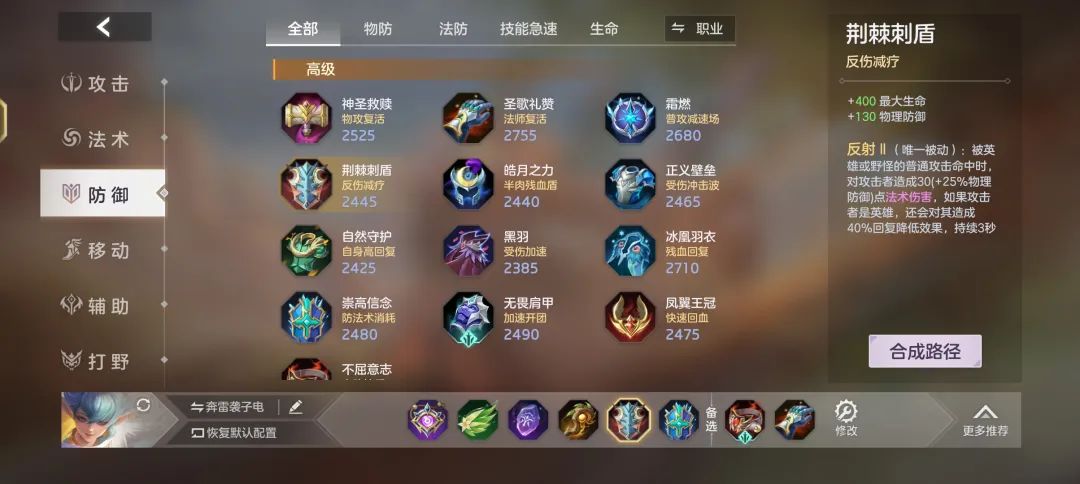 最后两件装备可以根据情况选择荆棘刺盾,崇高信念或者黑羽,如果你们这里缺少一定开团能力,可以出荆棘刺盾,主动重进对方人堆,吸引火力,为队友创造输出;如果对面法术伤害较多,可以选择黑羽增加生存能力;如果对面先手控制较多,就可以选择崇高信念增加自身生存能力。